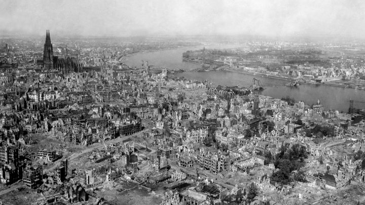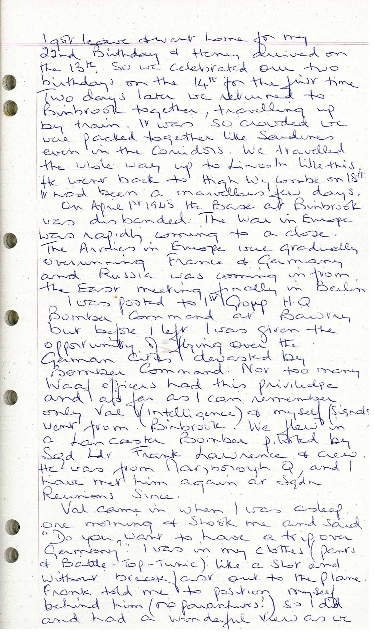 … but before I left I was given the opportunity of flying over the German cities devastated by Bomber Command. Not to many WAAF Officers had this privilege and I am far as I can remember only Val (Intelligence) and myself (Signals) went from Binbrook. We flew in a Lancaster Bomber piloted by Sqd Ldr Frank Lawrence and crew. He was from Maryborough Qld, and I have met him again at Sqdn Reunions since.