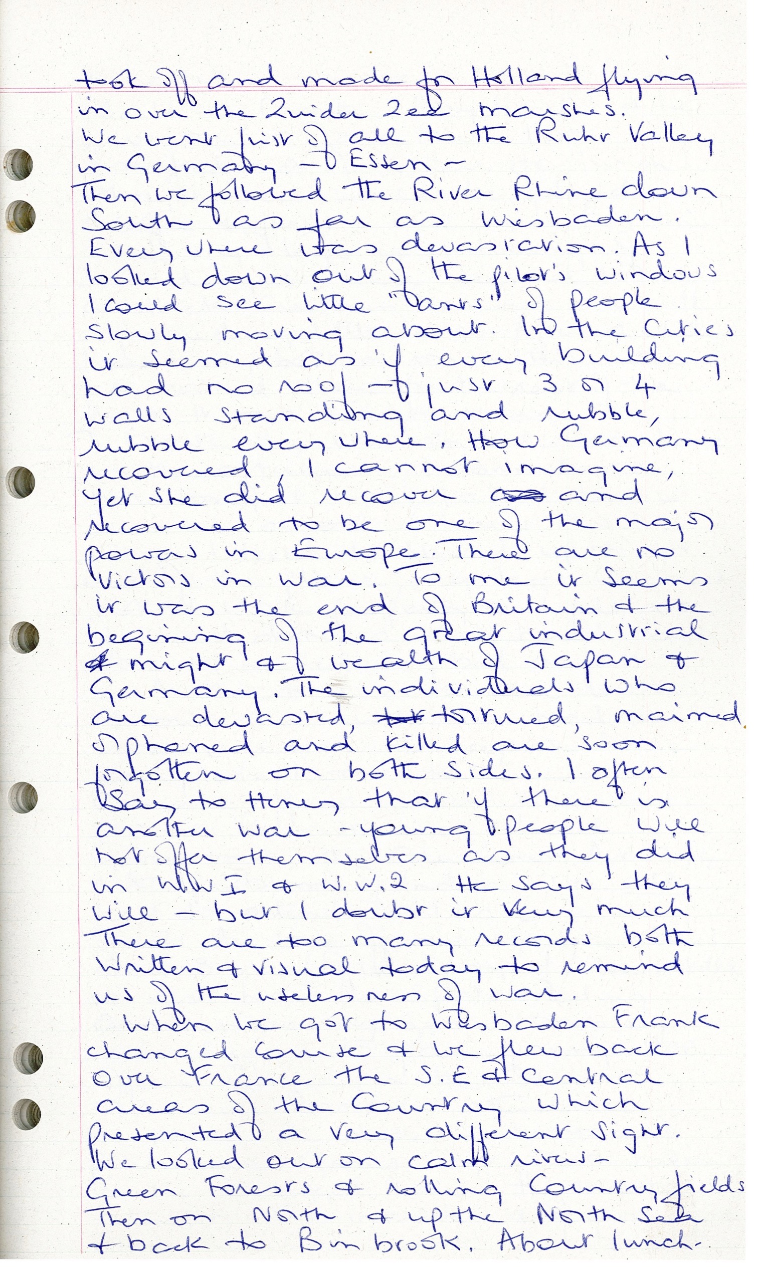 Then we followed the River Rhine down south as far as Wiesbaden. Everywhere was devastation. As I looked down out of the pilot’s windows I could see little “banks” of people slowly moving about. In the cities it seemed as if every building had no roof – just 3 or 4 walls standing and rubble, rubble everywhere. How Germany recovered I cannot imagine, yet she did recover and recovered to be one of the major powers in Europe. There are no victors in war. To me it seems it was the end of Britain and the beginning of the Great industrial might and wealth of Japan and Germany. The individuals who are devastated, tortured, maimed orphaned and killed are soon forgotten on both sides. I often sat to Henry that if there is another war – young people will not offer themselves as they did in WWI and WWII. He says they will – but I doubt it very much. There are too many records both written and visual today to remind us of the uselessness of war.